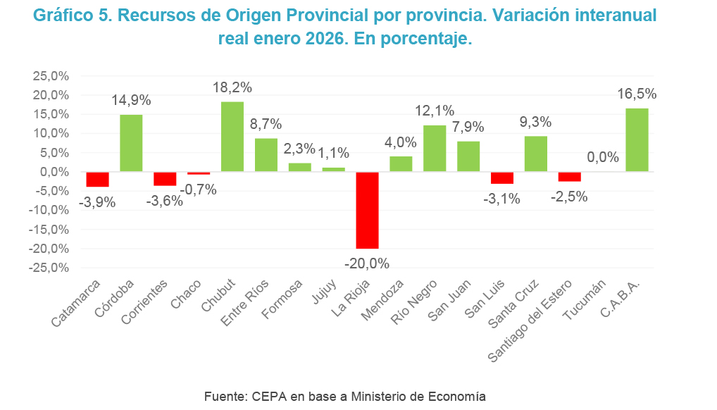 - En enero de 2026 (último dato disponible) los Recursos de Origen Provincial (ROP) se incrementaron 11,6% en términos reales interanuales. Seis provincias registraron caídas interanuales reales en recursos de origen provincial; La Rioja fue la más afectada (-20% i.a.). En contraste, once provincias mostraron mejoras, destacándose Chubut (+18,2%), Ciudad Autónoma de Buenos Aires (+16,5%) y Córdoba (+14,9%).