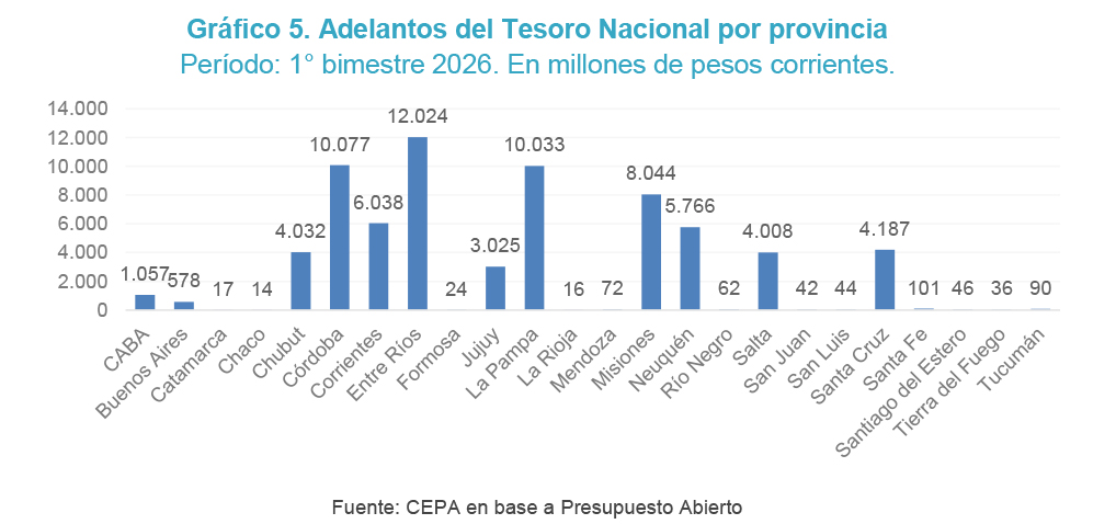 En materia de transferencias no automáticas —Adelantos del Tesoro Nacional (ATN)—, en el acumulado del primer bimestre de 2026 Entre Ríos fue la jurisdicción que concentró el mayor volumen de recursos, con más de $12.000 millones.
