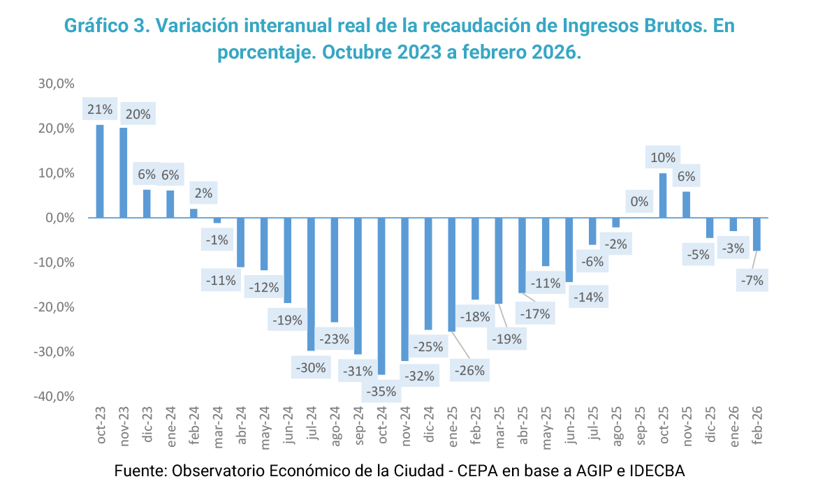 Analizando la dinámica de la recaudación propia de los últimos 24 meses, especialmente del Impuestos sobre los Ingresos Brutos, que como ya se advirtió es el principal ingreso de la Ciudad, se percibe un incremento real sostenido desde marzo 2023 hasta octubre de ese mismo año. A partir de octubre de 2023, Ingresos Brutos entra en un notable sendero de caída real de la recaudación. En los últimos meses se observa una estabilización en el cobro de este tributo, pero en un nivel más bajo. Entre octubre de 2023 y febrero 2026 la caída de la recaudación de Ingresos Brutos es del 39,3% en términos reales.