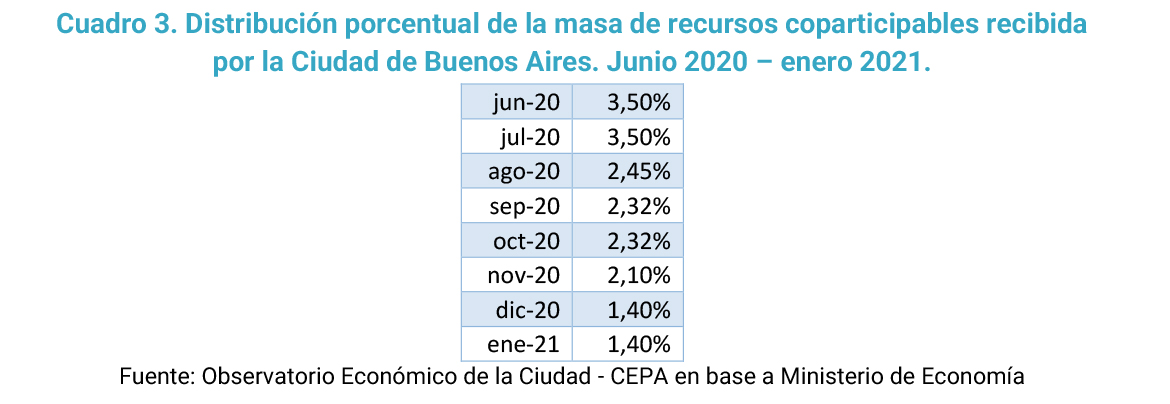 - Vinculado a este tema, el informe aborda el debate entre Ciudad y Nación respecto al coeficiente de Coparticipación y el acuerdo alcanzado: 1,4% de coparticipación por goteo diario, es decir la forma habitual; y el 1,55% adicional por transferencia semanal.