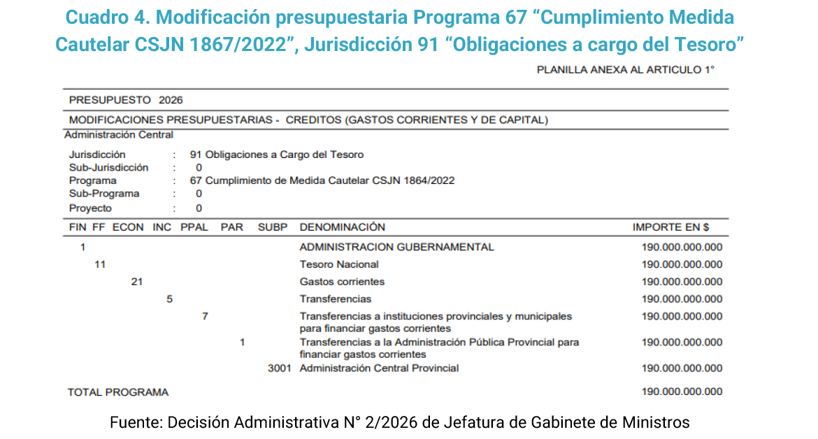 Durante los últimos meses del año pasado en pleno debate por el Proyecto de ley del Presupuesto 2026, nada se decía de este programa en el detalle enviado por el Gobierno al Congreso. En los primeros días de febrero, el Gobierno Nacional, a través de la Decisión Administrativa N° 2[2], incorporó 190 mil millones en las partidas correspondientes a las transferencias a la Ciudad por este concepto. Sin embargo, como se analiza más adelante, esto está lejos de resolver el conflicto ya que representa un monto levemente superior a lo correspondiente a un mes de transferencias. Además, es apenas una fracción de la creciente deuda de la Nación con la Ciudad que llega a 535 mil millones de pesos a precios de febrero 2026.