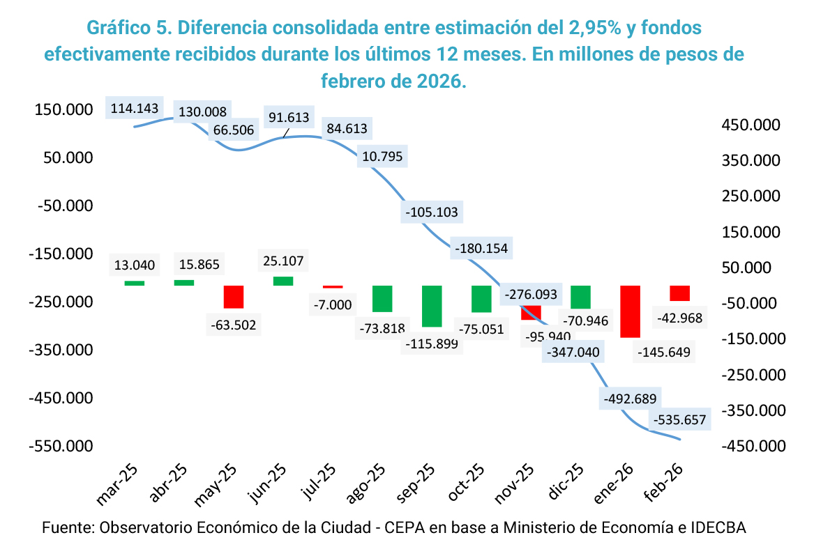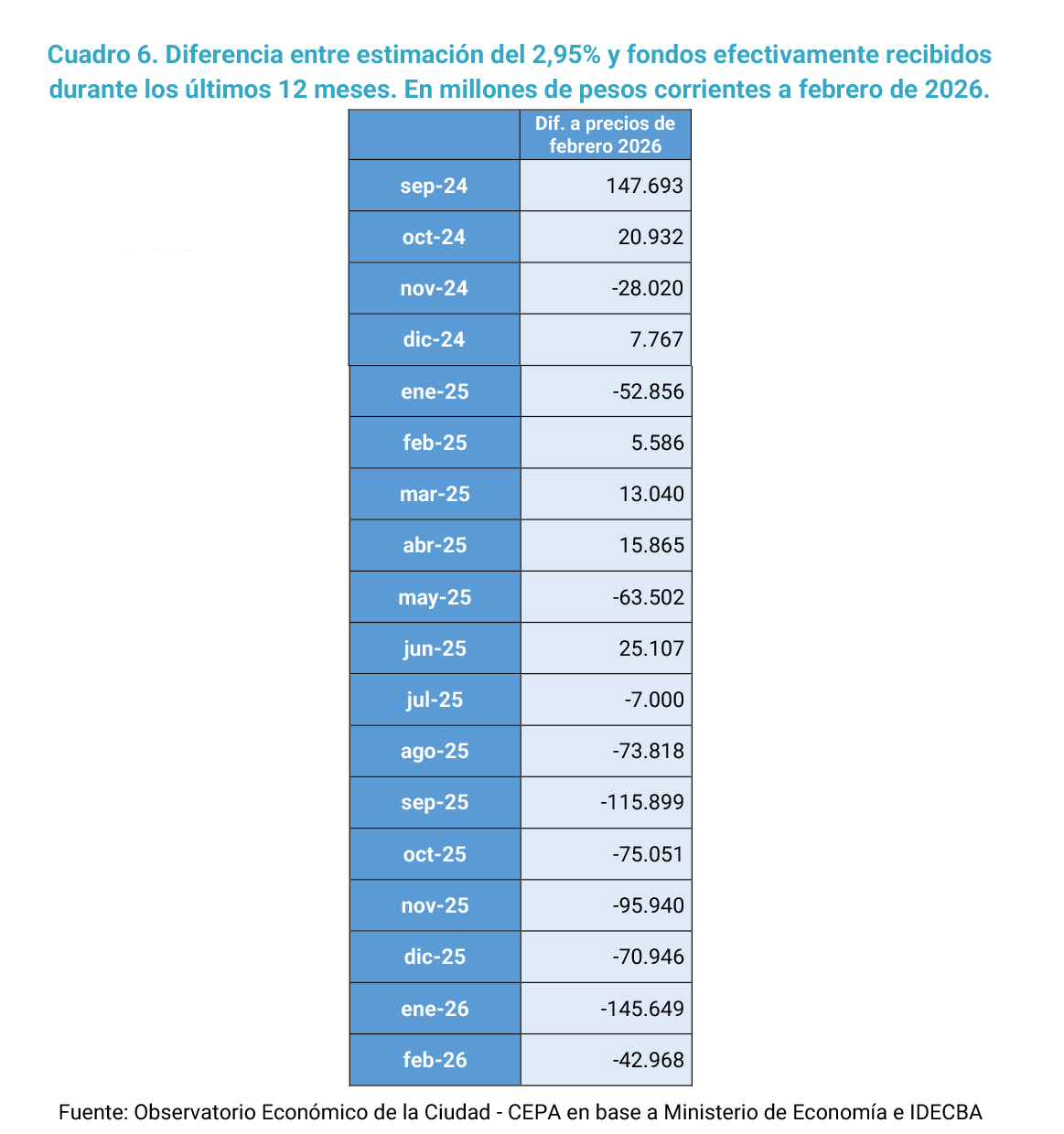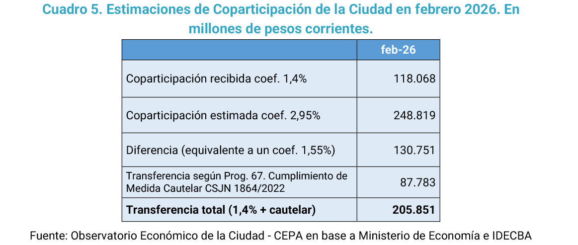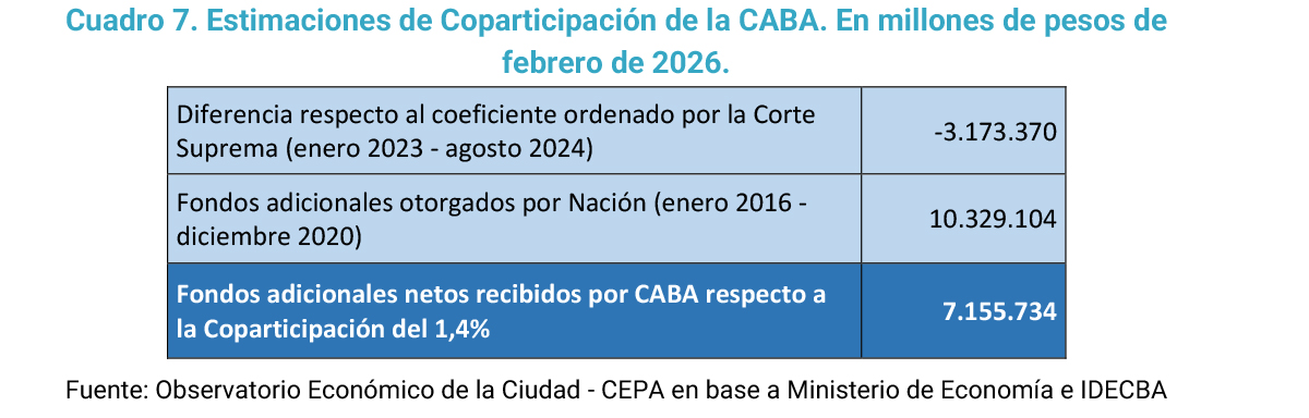 El CEPA realizó una estimación para conocer los montos de dinero en disputa. Durante el mes de febrero de 2026 la Ciudad recibió más de 118,1 mil millones de pesos de coparticipación y financiamiento educativo, equivalente al 1,4% de la masa de fondos coparticipables. El monto equivalente al coeficiente de 1,55% de coparticipación, es decir el adicional que resulta de la medida cautelar de la Corte Suprema, debería ser de casi 130,8 mil millones de pesos. Sin embargo, como ya se señaló, Nación transfirió en concepto de medida cautelar unos 87 mil millones de pesos. De esta forma, el monto efectivamente recibido durante el mes analizado fue de 205 mil millones de pesos, cuando de acuerdo al índice fijado de 2.95% debería haberse transferido 248 mil millones.