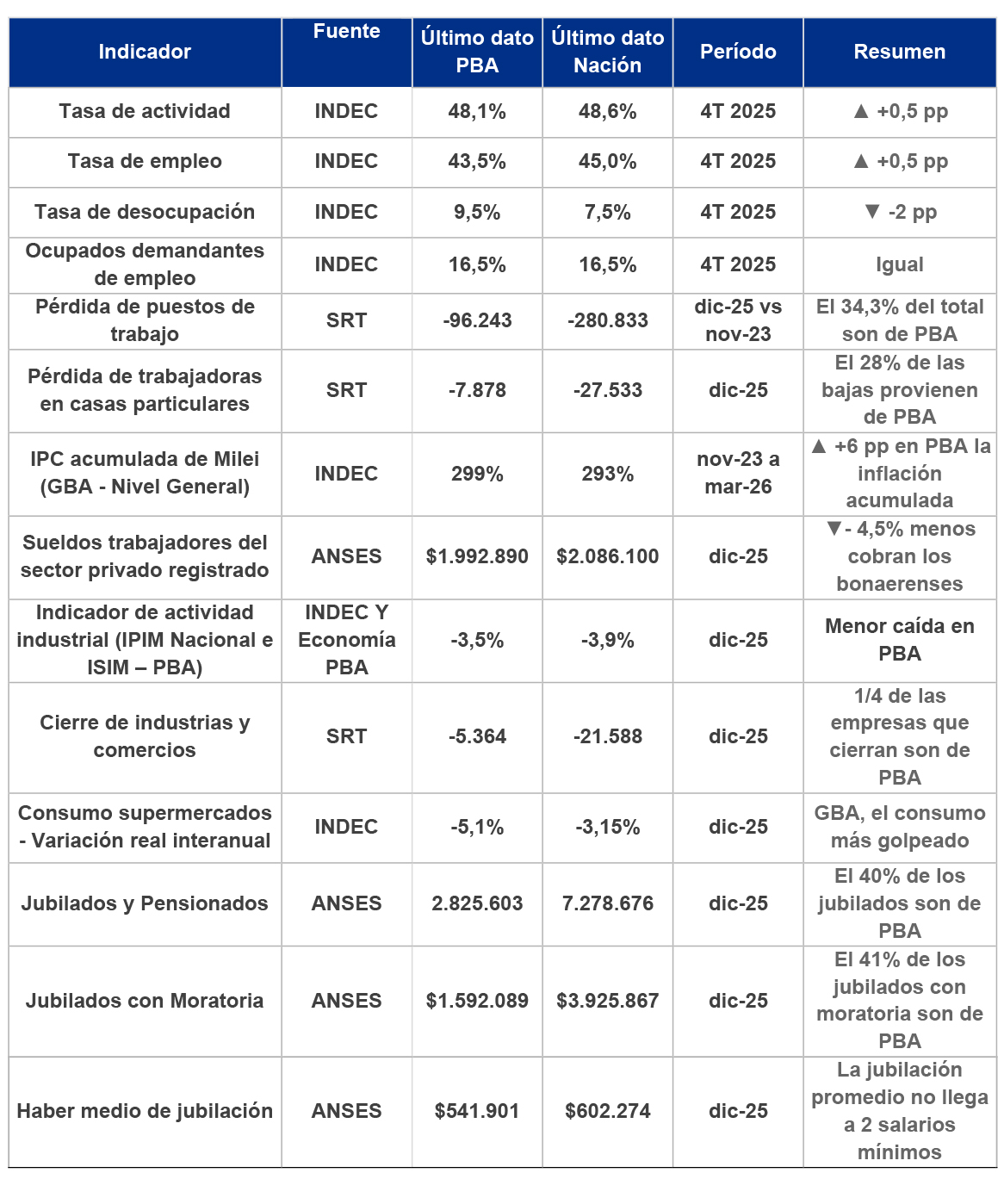 - Comparación territorial: Todos los indicadores se presentan comparando la Provincia de Buenos Aires con el total nacional.