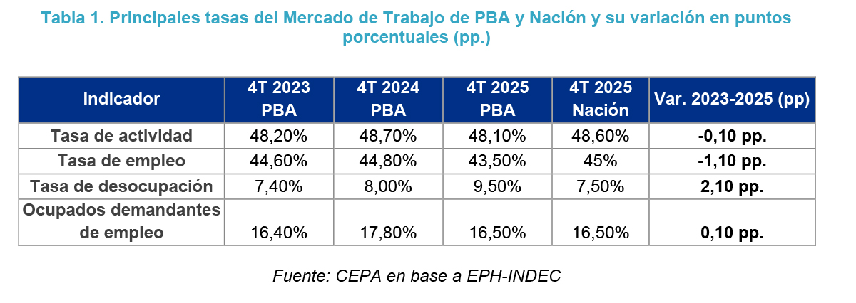 En la provincia de Buenos Aires (PBA), en el cuarto trimestre de 2025, la tasa de desocupación alcanzó el 9,5%. Este valor se ubica por encima del promedio nacional (7,5%) y también por encima del registrado dos años atrás en la provincia (7,4%).