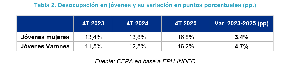 Finalmente, resulta clave destacar la situación del desempleo entre los jóvenes (14 a 29 años), donde se observa un deterioro significativo en los últimos años. En el cuarto trimestre de 2025, la tasa de desocupación alcanzó el 16,8% en mujeres jóvenes y el 16,2% en varones jóvenes, evidenciando incrementos de 3,4 y 4,7 puntos porcentuales respectivamente desde 2023. Ambos guarismos se encuentran muy por encima del promedio nacional (7,5%).