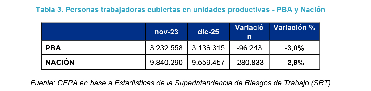 El desempeño de este sector también puede evaluarse desde la llegada de Javier Milei a la presidencia. Cuando el análisis se hace siguiendo este intervalo, diciembre de 2025 versus noviembre 2023, la caída entre el guarismo nacional y el de la provincia de Buenos Aires es similar.