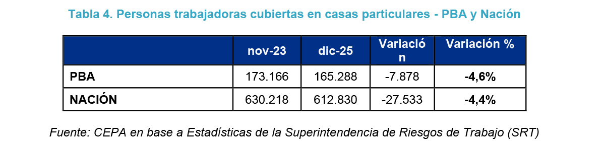 A su vez, el deterioro de ingresos y empleo se propaga hacia sectores laborales históricamente más vulnerables. La caída en la cantidad de hogares que contratan personal es un indicador revelador: al mes de diciembre de 2025 se registraron 7.878 bajas personas trabajadoras en casas particulares en la Provincia de Buenos Aires, casi un tercio del total nacional.