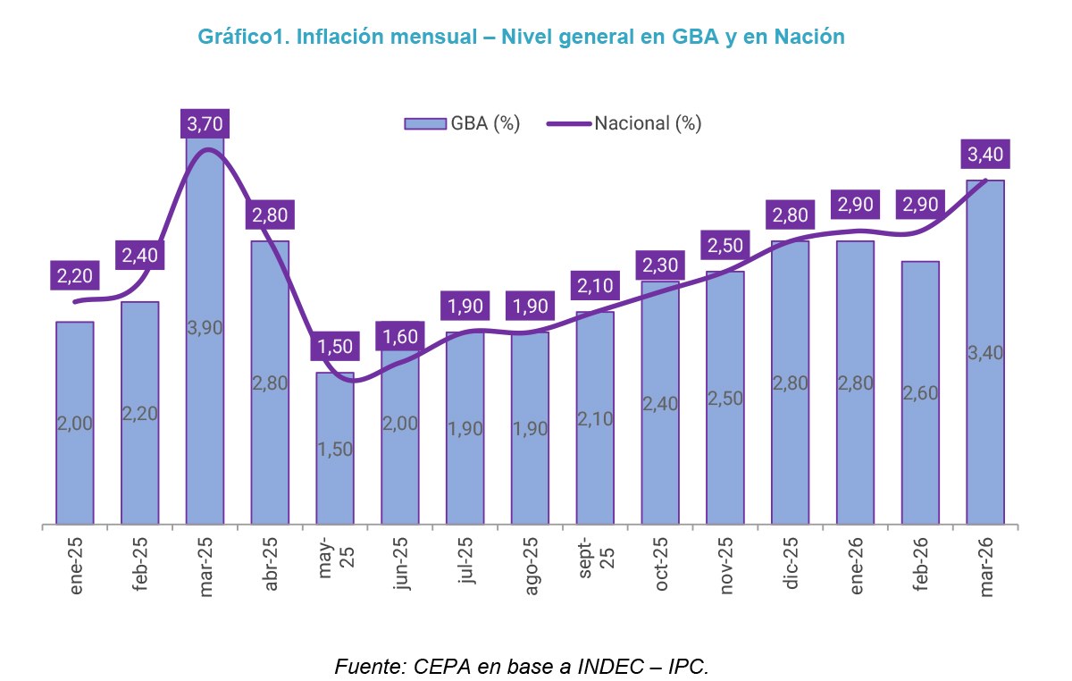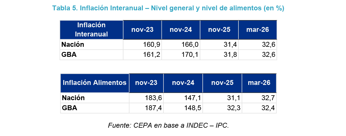 Los datos de marzo de 2026 confirman una tendencia preocupante: la inflación viene acelerando desde junio de 2025, y la situación es grave porque no logra frenar el crecimiento de los precios. En alimentos la inflación interanual a marzo de 2026 se ubicó en 32,7% a nivel nacional, en el GBA alcanzó al 32,4%, impactando de lleno en el presupuesto de los sectores de menores ingresos, que destinan una mayor proporción de sus ingresos a la canasta básica.