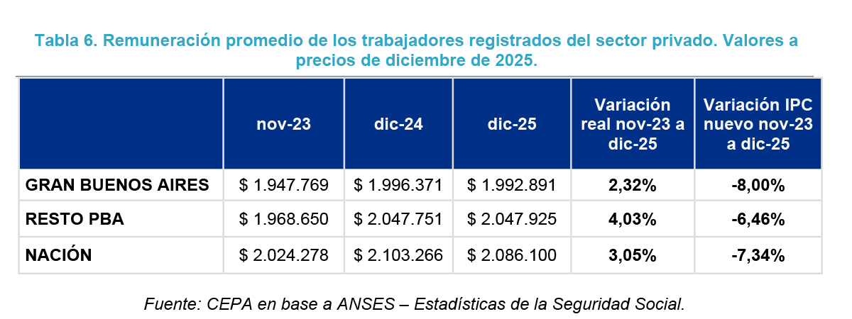 Entre noviembre de 2023 y diciembre de 2025, el salario real promedio de los trabajadores registrados del sector privado creció apenas un 2,3% en el Gran Buenos Aires, medido a precios constantes. El contraste con otras regiones es significativo: el resto de la Provincia de Buenos Aires acumuló una mejora real del 4% y la Nación del 3,05%, dejando al GBA como la región con peor desempeño relativo.