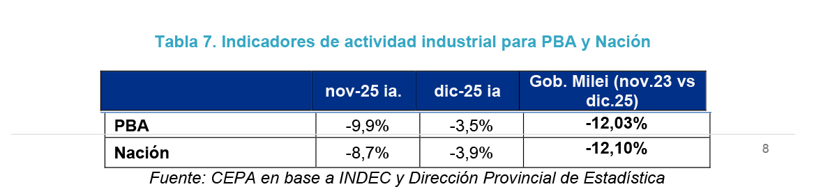 La crisis industrial puede observarse mediante el Indicador Sintético Industria Manufacturera de la provincia de Buenos Aires (ISIM-PBA, desarrollado por la Dirección Provincial de Estadística) que mostró una caída del 9,9% en noviembre de 2025 y del 3,5% en diciembre del mismo año, en ambos casos la comparación es respecto del mismo mes del año anterior. Puede observarse que durante noviembre el guarismo de PBA mostró un peor desempeño que el indicador del INDEC a nivel nacional (-9,9% versus