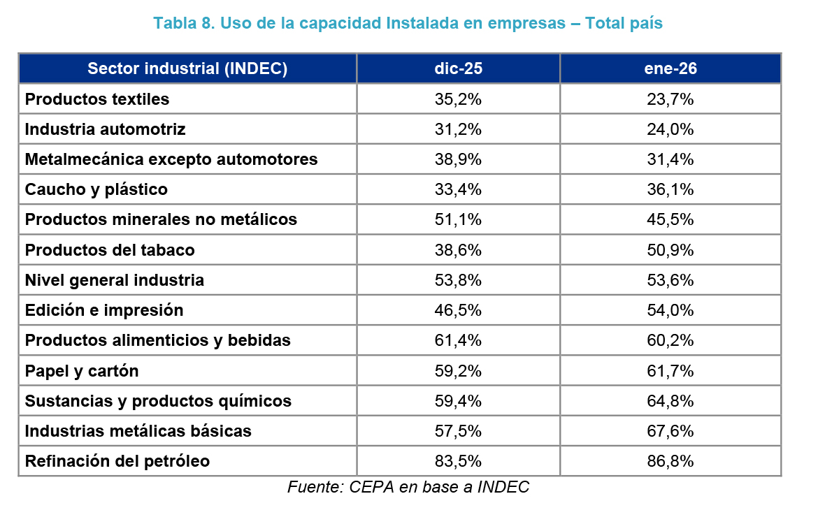 Resulta importante destacar la fuerte caída de este guarismo en su comparación con el mes anterior (dic-25) para la industria automotriz (-7,2 pp.), metalmecánica (-7,5 pp.) y productos textiles (-11,5 pp.). Este estrepitoso desempeño de la industria redunda en decisiones empresarias que afectan a los y las trabajadoras como, por ejemplo, la decisión de la empresa Stellantis (que produce y comercializa vehículos Citroën, Fiat y Peugeot en el país) que eliminará un turno en la planta de El Palomar a partir de mayo.