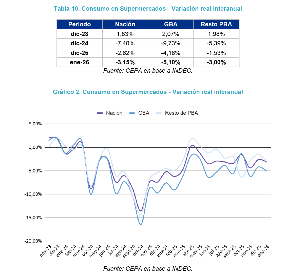 En enero de 2026, las ventas en supermercados acumulan una caída real interanual de 3,15% a nivel nacional y 5,1% en el GBA, consolidando una tendencia negativa que se extiende a lo largo de 2024 y 2025. Tras el fuerte deterioro registrado en 2024, el consumo mostró una recuperación parcial durante la primera mitad de 2025, aunque sin retornar a terreno positivo. En la segunda mitad del año esa mejora se diluyó, y el inicio de 2026 confirma que el nivel de consumo real sigue por debajo del del año anterior.