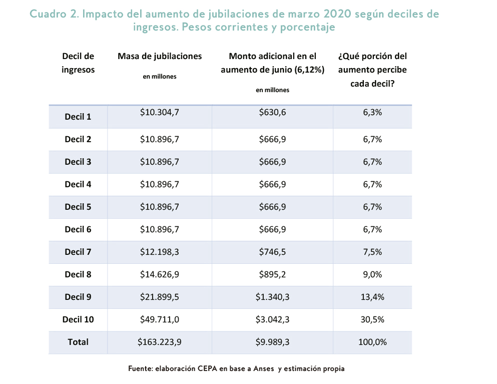 Como se observa en el Cuadro 2, los deciles 9 y 10 (el 20% de mayores ingresos) reciben casi el 45% del aumento (43,4%). En contraste, el 60% recibe sólo el 39,7% del aumento de junio, lo que da cuenta de la desigual distribución de la masa de jubilaciones entre deciles.
