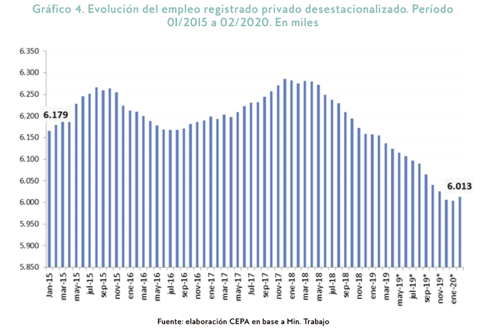 b- A la par de la caída del salario, se percibe una importante reducción del empleo registrado privado. Si se compara febrero de 2015, donde se computaban 6,179 millones de trabajadores y febrero de 2020, donde se estimaban 6,013 millones de trabajadores, la reducción del empleo significó 165 mil puestos de trabajo menos. Es decir, no sólo no aumentó el empleo a la par del crecimiento poblacional o la PEA, sino que se redujo sensiblemente.