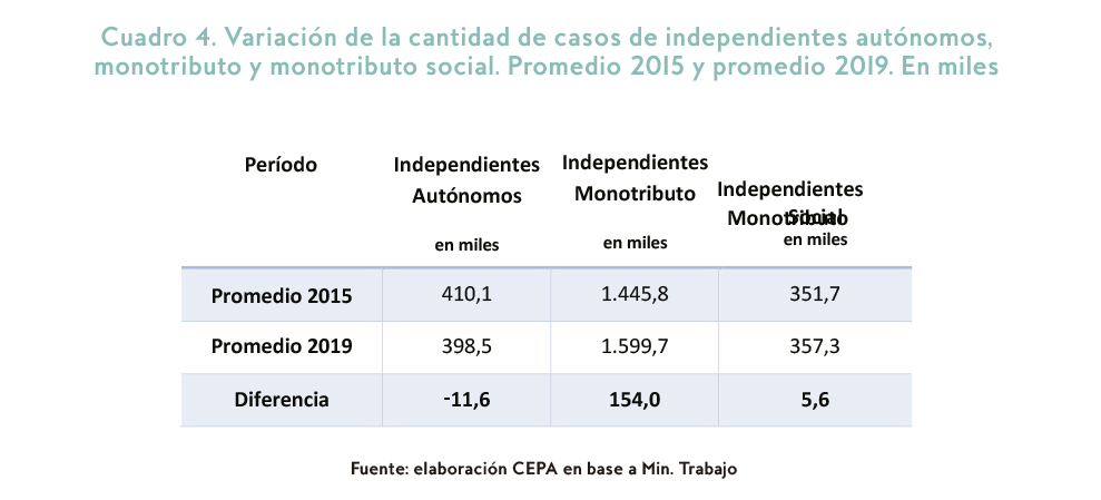 c- Como resultado de la configuración del mercado de trabajo a lo largo de los últimos cuatro años, a la par de la reducción del empleo registrado se vislumbra un incremento del monotributismo, cuyos aportes al Sistema de Seguridad Social resultan sensiblemente menores a los del trabajo registrado.