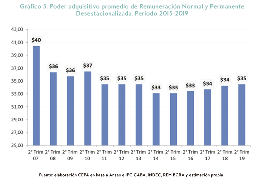 El sueldo de los trabajadores registrados es la principal fuente de recaudación de recursos de Seguridad Social. Los salarios registrados privados se redujeron notablemente entre 2015 y 2019. La caída supera el 15% promedio, con un agravante: hacia diciembre, la reducción resulta particularmente sensible, lo que implica un punto de partida muy bajo para las discusiones paritarias de 2020.