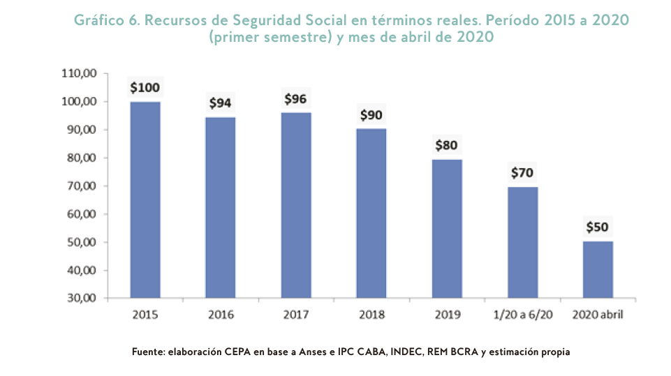 3- La recaudación de recursos de la Seguridad Social se redujo sensiblemente. Hasta 2019, en promedio, la percepción de recursos implicó una caída de más de 20% respecto del promedio de recaudación de 2015. Ahora bien, la situación en 2020 se agravó aún más. Si se considera el promedio del primer semestre, considerando el aguinaldo de junio, y la estimación de inflación mencionada anteriormente, la caída alcanza a más de 30% respecto del promedio de 2015 [4]. Peor aún, el efecto de la cuarentena sobre la actividad económica sólo para el mes de abril significará probablemente una reducción del 50% en la recaudación real respecto al promedio de 2015.
