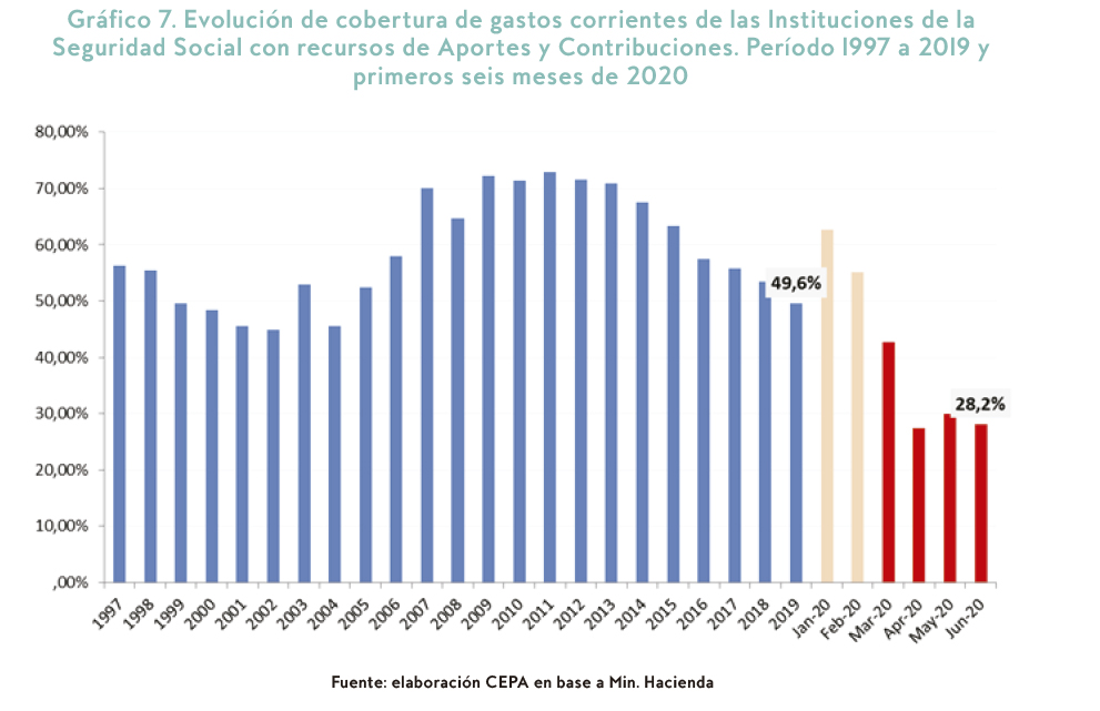 Esta situación ocurre a lo largo del primer semestre 2020, que debe responder a una inflación pasada más alta que la actual (jubilaciones más elevadas) y no está acompañado de mejor recaudación, sino de una aún más baja (como resultado de una inflación más baja y agudizada por el impacto del aislamiento por COVID). A su vez, la postergación y condonación de contribuciones patronales (además del atraso en pagos), junto con los acuerdos de reducciones salariales han afectado de manera significativa los montos percibidos por ANSES.