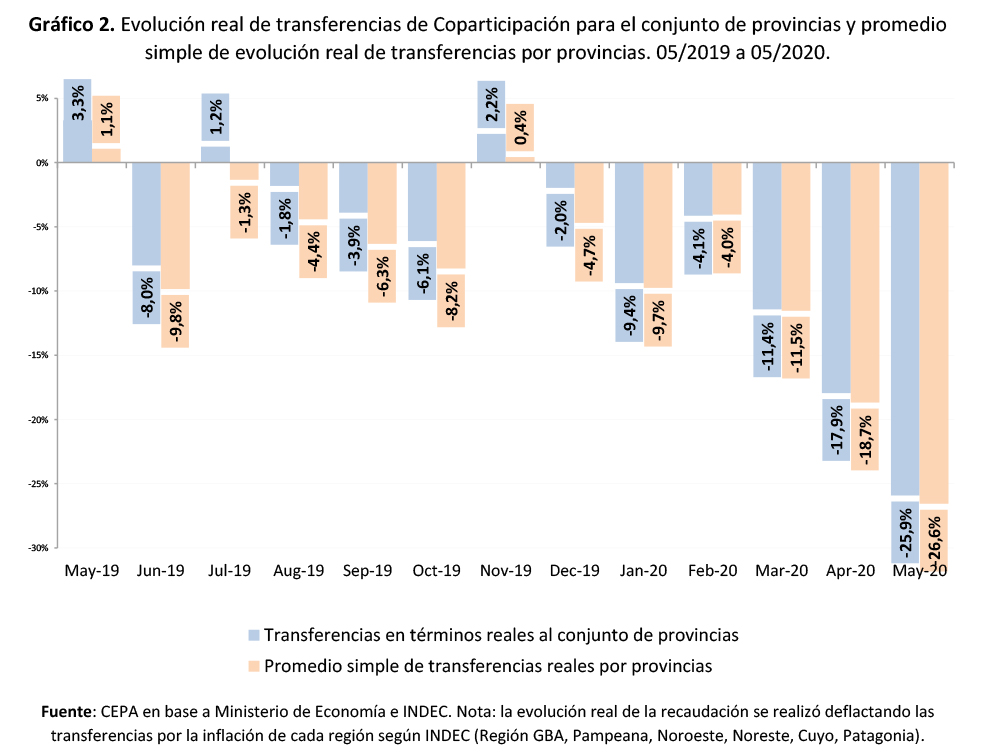 La evolución es similar si se considera el promedio simple de la evolución real de las transferencias para cada provincias (-11,5% en marzo, -18,7% en abril y -26,6% en mayo).