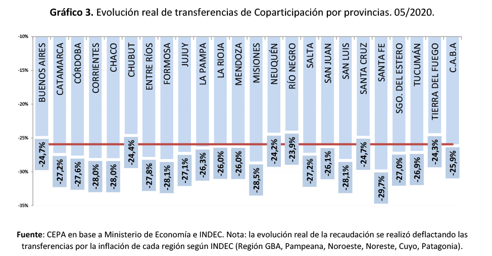 El gráfico a continuación muestra el impacto real de los recursos de Coparticipación para el conjunto de provincias. En la sucesión de meses que van de marzo a mayo es posible observar el efecto in crescendo de la pandemia sobre la recaudación: -11,4% en marzo, -17,9% en abril y -25,9% en mayo.