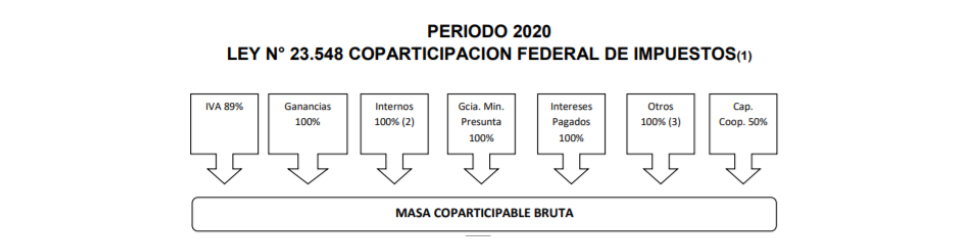 La masa coparticipable bruta se conforma del 100% del Impuesto a las Ganancias (ley 20.628), el 89% del IVA (leyes 23.966 y 27.432), el 100% de los Impuestos Internos Coparticipables (ley 26.674), además de otros impuestos menores.