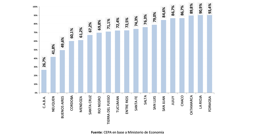 Los ingresos provinciales provienen básicamente de dos fuentes: recursos propios (principalmente, Ingresos Brutos, Inmobiliario, Automotor y Sellos) y recursos de Coparticipación. En lo que respecta a las transferencias por Coparticipación, estas representan una buena parte de los ingresos provinciales: en promedio, alcanzan el 71,3% del total. Como se percibe en el Gráfico 1, algunas provincias presentan un alto nivel de dependencia de los recursos nacionales coparticipables, como Formosa, La Rioja, Catamarca, Chaco, Jujuy, San Juan, mientras que en el otro extremo, los niveles de recaudación de recursos locales son sensiblemente mayores, como en el caso de la Ciudad de Buenos Aires.