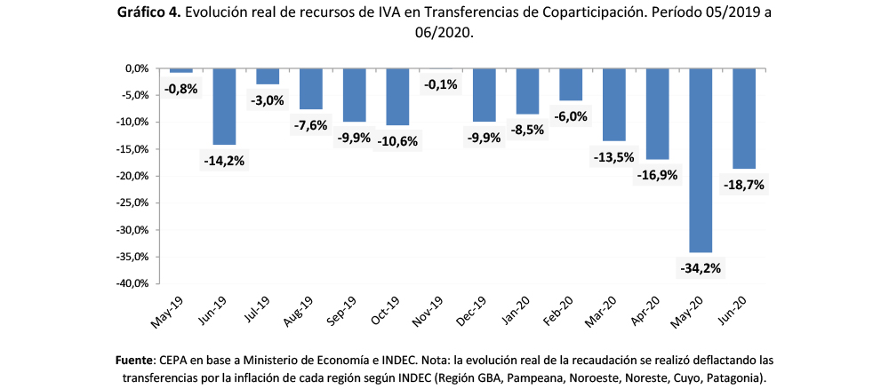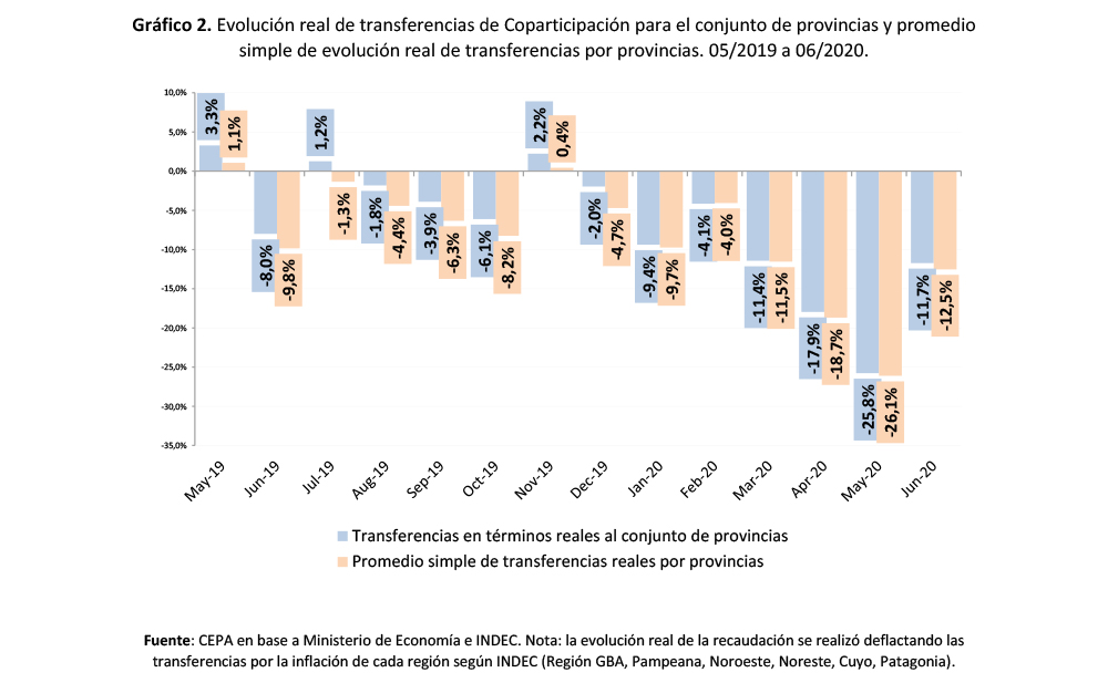 La evolución es similar si se considera el promedio simple de la evolución real de las transferencias para cada provincias (-11,5% en marzo, -18,7% en abril, -26,6% en mayo y -12,5% en junio).