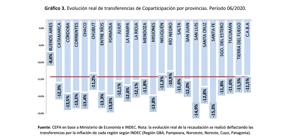 Al considerar la situación provincia por provincia, es posible distinguir que la pérdida en términos reales de las transferencias por Coparticipación tiene en sus extremos a Buenos Aires, con una caída de 8,6% y Santa Fe, con una contracción de 15,3%, en un escenario donde, salvo Buenos Aires, el resto supera el 10% de caída real.