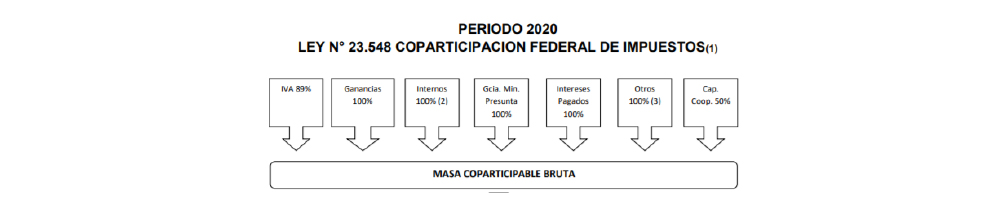 La masa coparticipable bruta se conforma del 100% del Impuesto a las Ganancias (ley 20.628), el 89% del IVA (leyes 23.966 y 27.432), el 100% de los Impuestos Internos Coparticipables (ley 26.674), además de otros impuestos menores.