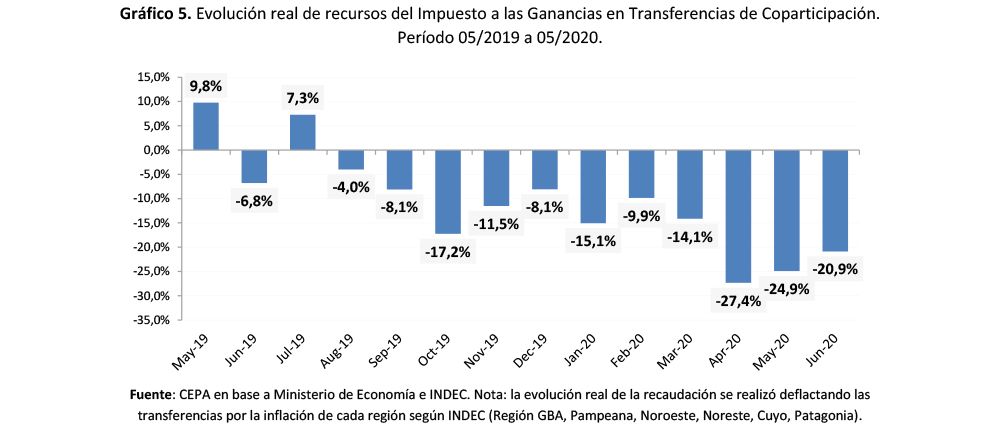 El presente informe realiza una aproximación de impacto mencionado a través del análisis y seguimiento de la evolución real de las transferencias por Coparticipación a las provincias en el mes de junio de 2020, en virtud de una comparación con el último año. A la par, esa misma información se utilizó para estimar la evolución real del Impuesto a las Ganancias y de IVA.