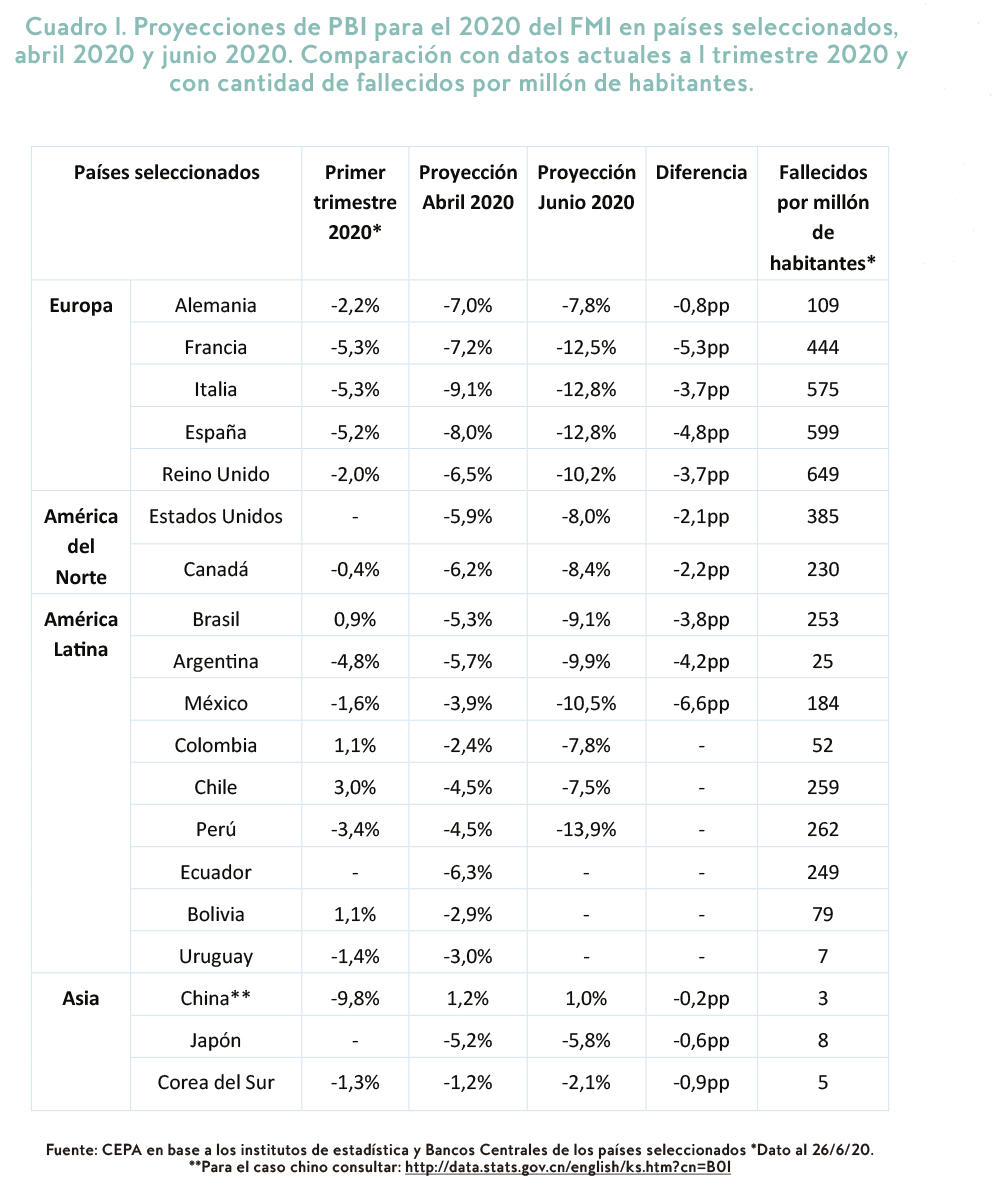 En América del Norte, Canadá registra un leve descenso del PBI durante el primer trimestre de 2020 (-0,4). En América Latina Argentina tiene el peor registro de caída de PBI durante el primer trimestre (-4,8%), seguido por Perú (-3,4%), México (-1,6%) y Uruguay (-1,4%). Si bien son varios países latinoamericanos que registran caídas en sus economías, no hay que olvidar que la Argentina viene sosteniendo varios trimestres en caída de su actividad debido a la crisis económica generada bajo el anterior gobierno de Mauricio Macri, por lo tanto, al arribo de la pandemia en marzo hay que sumarle la crisis económica que el país viene arrastrando a la hora de hacer el análisis de la caída de actividad del país. De todas formas, y como en los otros dos continentes analizados, el virus no hará excepciones: las proyecciones del FMI para todos los países son de caída del PBI.