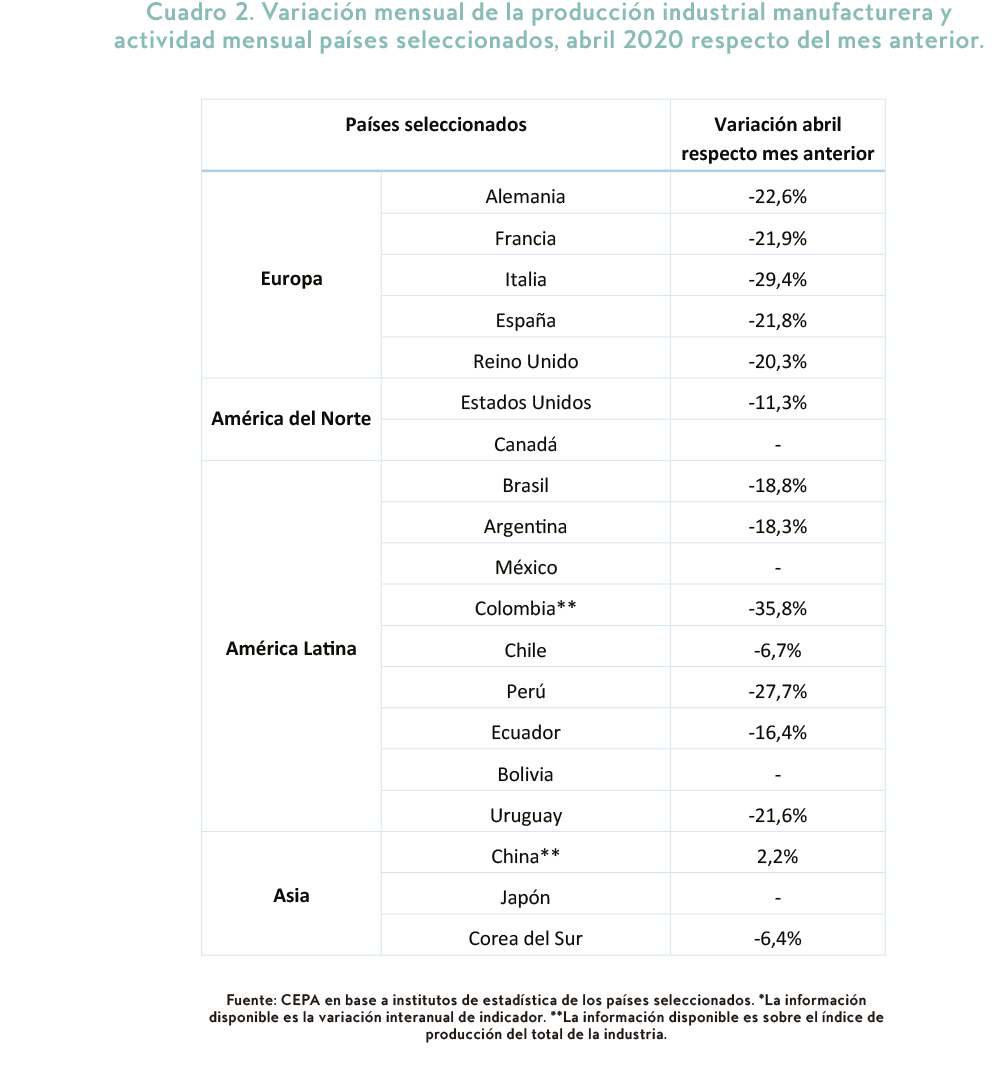 - Ya se registran retrocesos de la producción industrial de dos dígitos. La caída de la producción en los países europeos es de una magnitud relevante, todos por encima del 20% en el mes de abril 2020 respecto de marzo, encabezados por Italia (-29,2%) y Alemania (-22,6). En Estados Unidos, la producción industrial en abril cayó un 11,3%.