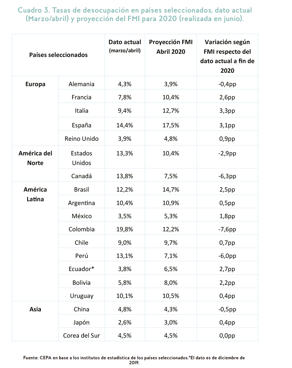 En suma, el Cuadro 3 arroja la contracara del impacto económico que tiene la pandemia en la economía: el desempleo. La gran mayoría de los países registra un incremento en sus tasas de desocupación y el FMI estima que, en su mayoría se mantendrán estables en los niveles actuales durante todo el año. Esto con excepción de algunos países donde, se estima, la tasa de desempleo se disparará aún más como por ejemplo España (17,5%), Italia (12%), Francia (10,4%) y Brasil (14,7%).