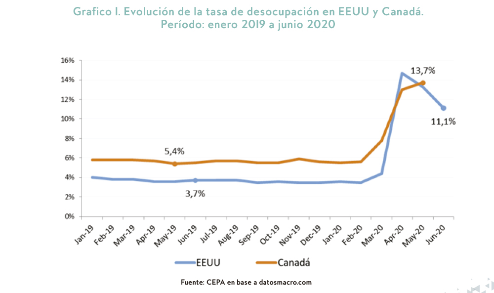 - En Estados Unidos la tasa de desocupación se encontraba en 4% en junio 2019 y asciende, un año más tarde a 11%. En el caso de Canadá la curva es similar: de 5% de desempleo en junio 2019, la suba llega a 14% para el mes de mayo.