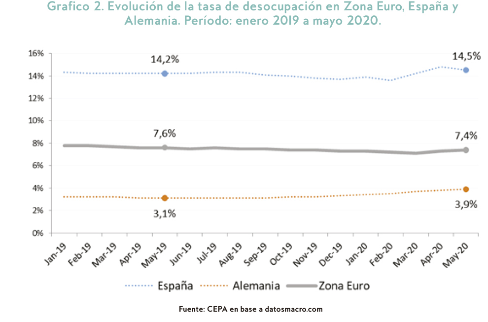 Por su parte, Alemania también registró un resultado negativo durante el primer período del año. De forma interanual cayó un 2,3%, la caída más grave desde el segundo trimestre del 2009, como se evidenció en el Reino Unido. Esta pequeña comparación permite observar que la pandemia ha impactado de manera similar en dos países que han tomado medidas de confinamiento y distanciamiento social diferentes. Mientras Alemania destinó una mayor preocupación a este aspecto y prohibió reuniones y ciertas actividades económicas, Londres optó por mantener la economía abierta el mayor tiempo posible. A pesar de esto, el impacto económico ha sido similar, lo que demuestra que la crisis es producto de la pandemia y no de las cuarentenas. Berlín también registró una fuerte caída industrial interanual en abril, 31,2% según CEPXXI, y la Oficina Federal de Empleo (BA) informó que para fines de mayo el desempleo había aumentado hasta el 6,1% con una pérdida de casi medio millón de puestos entre abril y mayo y registró, de esta manera, su primera contracción interanual desde el 2010.