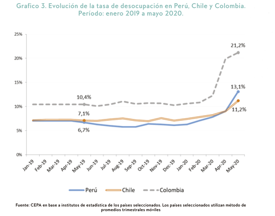 - Perú, Chile y Colombia tienen importantes subas de desempleo asociadas al impacto de la pandemia. En Chile el ascenso en el último año es de 7% a 11%, en Colombia de 10% a 21% y en Perú de 7% a 13%.