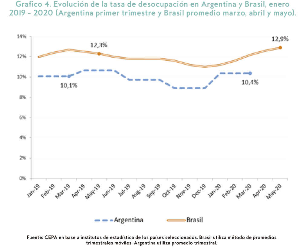 Con la pandemia, en Brasil la tasa de desocupación ha subido en el último año 1 punto más: de 12% a 13% y en Argentina por el momento se mantiene estable en 10%, pero las estimaciones privadas indican que la suba podría adicionar cerca de 5 puntos porcentuales más en los principales aglomerados urbanos del AMBA.