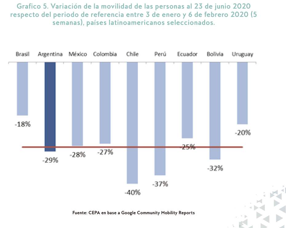 Al observar la evolución de esta misma variable promedio en otros países latinoamericanos, vemos que Argentina no es el país con mayores restricciones a la movilidad, siendo que Chile presenta una reducción del 40% respecto del mismo periodo enero-febrero, Perú del 37% y Bolivia del 32%. Países con la misma caída en el indicadores de movilidad como Argentina son México (28%) y Colombia (-27%). Los datos se presentan en el Gráfico 5 debajo.