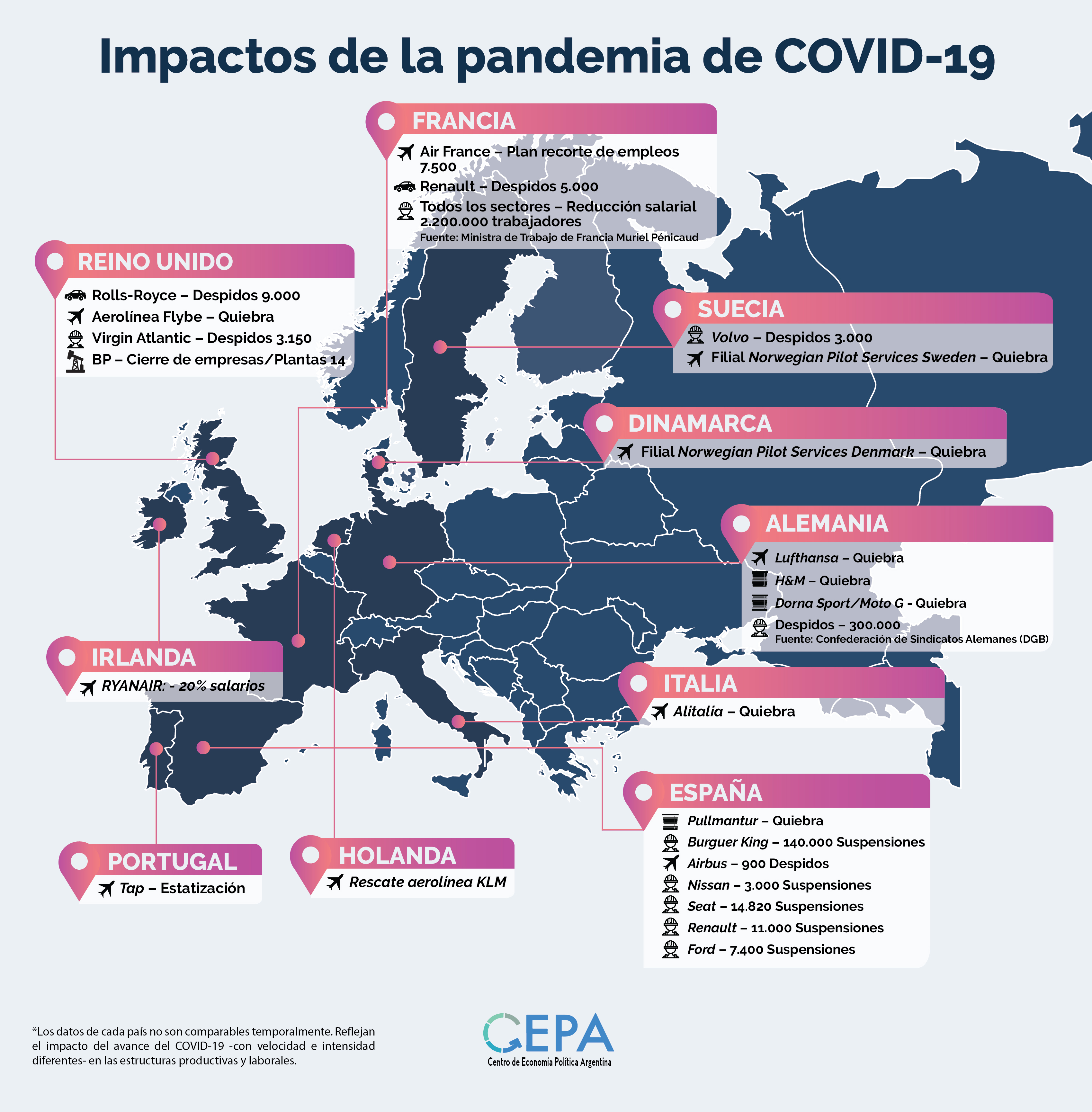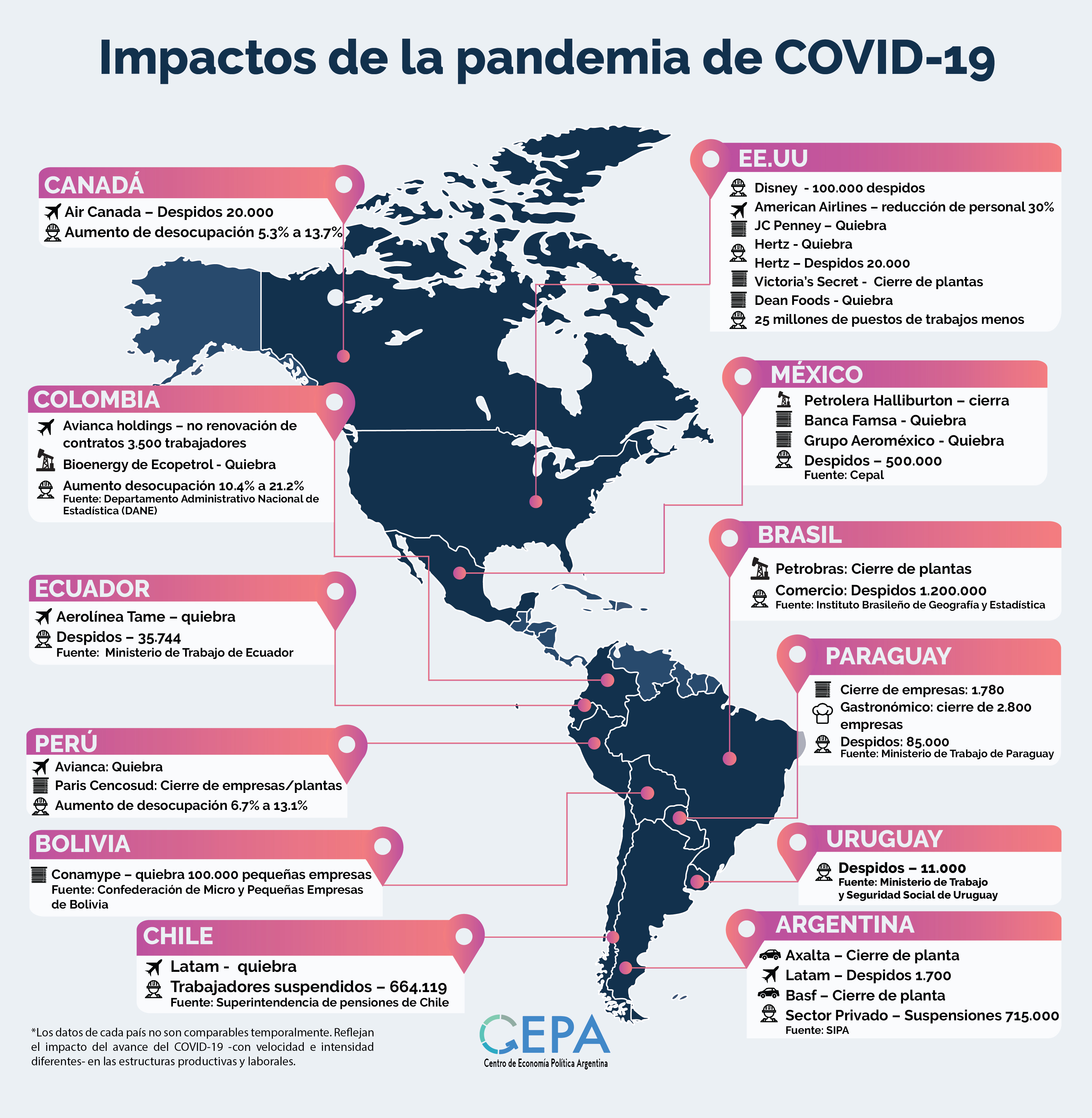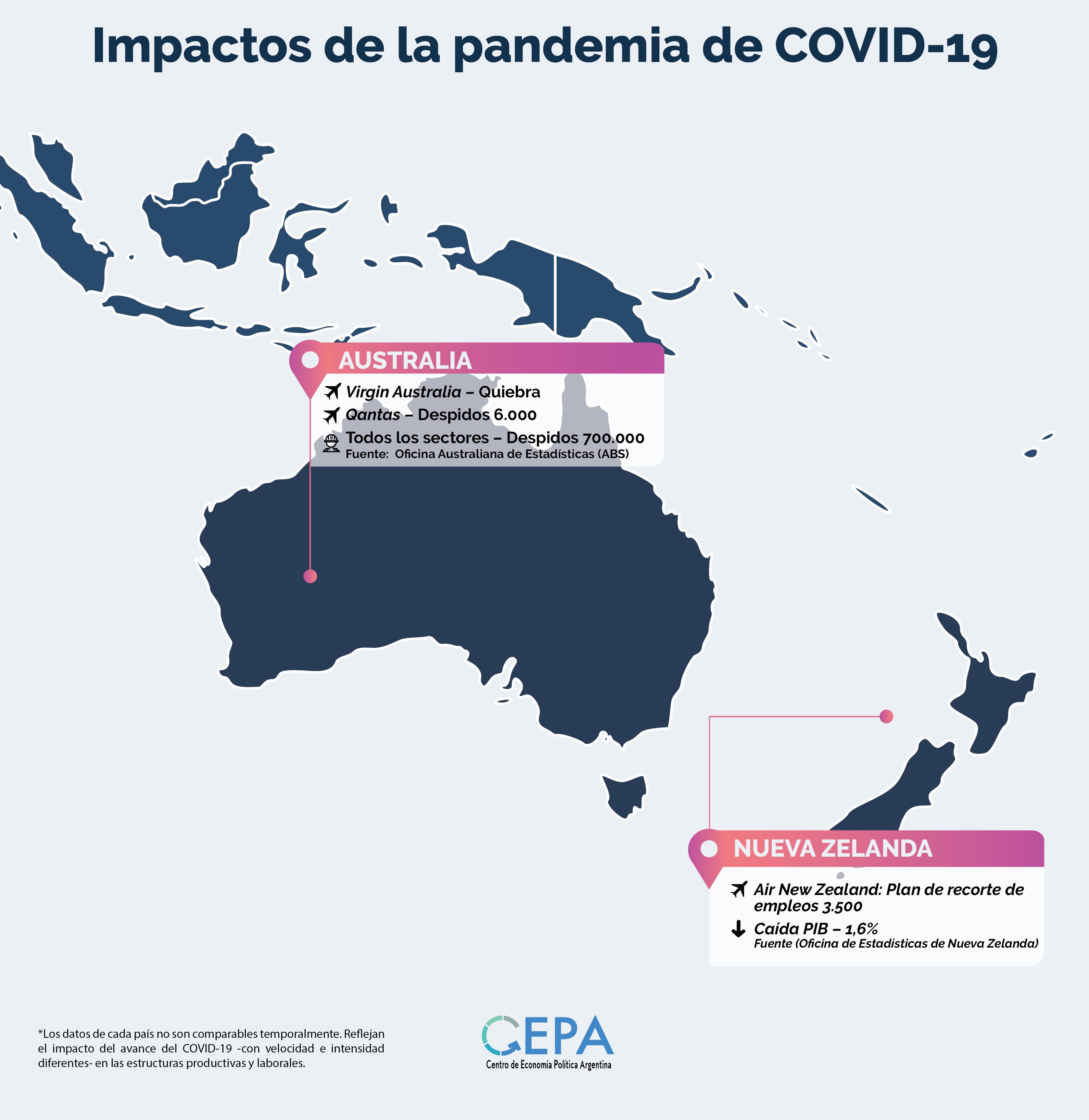 Compartimos una serie de infografías sobre los impactos de la pandemia en la estructura productiva y en el empleo en distintos países de América, Europa y Oceanía.