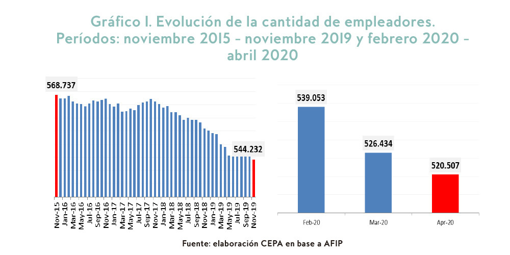 El informe se divide en cuatro partes. En el primer apartado se indaga acerca de la evolución de la cantidad de empresas entre el dato inicial de diciembre de 2015 (correspondiente a la cantidad de casos a finales de noviembre de 2015) y noviembre de 2019 de la base de AFIP y la cantidad de trabajadores/as, en el mismo período, que surge de la base del Ministerio de Trabajo en su serie desestacionalizada [3]. A la par, se expone la evolución de las mismas variables en el período febrero a abril de 2020 con la intención de observar el impacto de la pandemia.