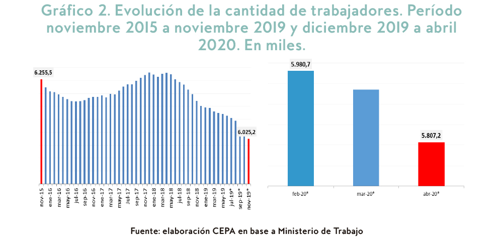La segunda parte aborda las variaciones de masa salarial y contribuciones patronales, mientras que en tercer orden se muestra la evolución de la cantidad de empleados/as por tamaño de empresa y por actividad entre el dato inicial de diciembre de 2015 (correspondiente a la cantidad a finales de noviembre de 2015) y noviembre de 2019 y la comparación entre abril y febrero de 2020 (el impacto concreto de la pandemia).