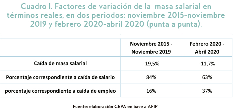 Si se compara, también punta a punta, abril de 2020 respecto de febrero 2020, se identifica una caída de 11,7%. Esta caída también se explica mayoritariamente por la reducción de salarios en términos reales (63%), mientras que el empleo retraído explica el 37%. CEPA lo anticipaba en el informe “El impacto del aislamiento en el mercado de trabajo, Parte 2” donde se consignaba un análisis luego del decreto-ley antidespidos y los subsidios a la actividad productiva y de servicios: “el gobierno apuesta fuerte: que no quiebren las empresas y que la cantidad de despidos no sea significativa. El objetivo es que los impactos de esta pandemia no signifiquen un cambio aún más duradero e irreversible en el mercado de trabajo”.[4]