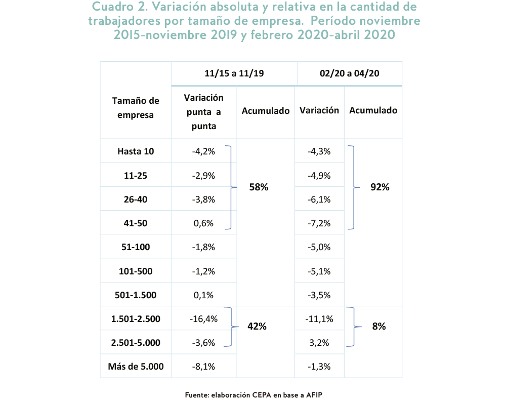 3- La variación de la cantidad de empleados por tamaño de empresas y por actividad durante la gestión de Cambiemos versus los meses de pandemia