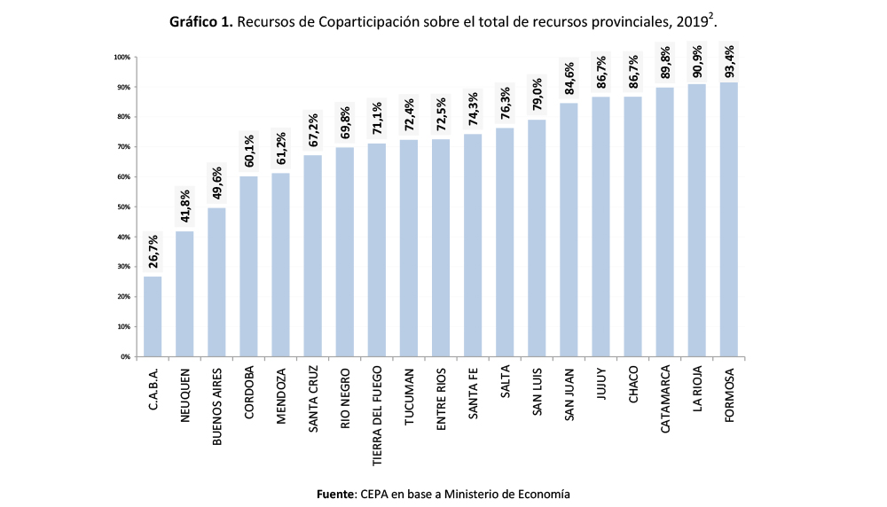 Los ingresos provinciales provienen básicamente de dos fuentes: recursos propios (principalmente, Ingresos Brutos, Inmobiliario, Automotor y Sellos) y recursos de Coparticipación. En lo que respecta a las transferencias por Coparticipación, estas representan una buena parte de los ingresos provinciales: en promedio, alcanzan el 71,3% del total. Como se percibe en el Gráfico 1, algunas provincias presentan un alto nivel de dependencia de los recursos nacionales coparticipables, como Formosa, La Rioja, Catamarca, Chaco, Jujuy, San Juan, mientras que en el otro extremo, los niveles de recaudación de recursos locales son sensiblemente mayores, como en el caso de la Ciudad de Buenos Aires.