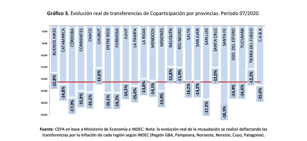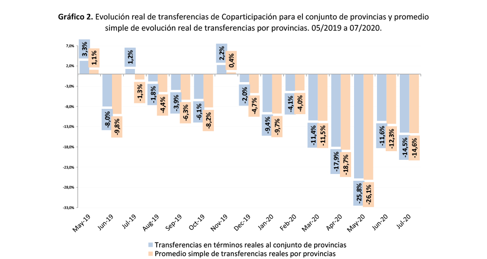 La evolución es similar si se considera el promedio simple de la evolución real de las transferencias para cada provincias (-11,5% en marzo, -18,7% en abril, -26,1% en mayo, -12,3% en junio y -14,6% en julio).