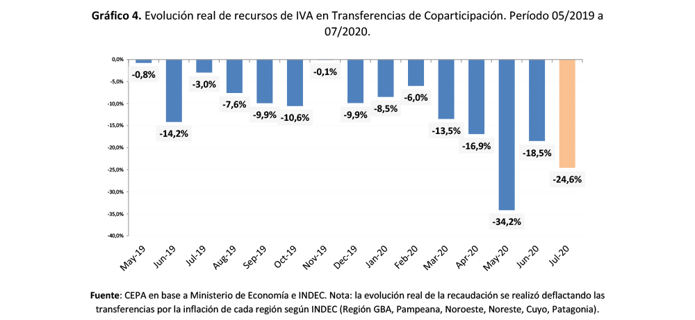 - La caída, en términos reales, de los recursos de Coparticipación para el conjunto de provincias alcanzó, en julio, 14,5%.En la sucesión de meses que van de marzo a mayo es posible observar el efecto in crescendo de la pandemia sobre la recaudación: -11,4% en marzo, -17,9% en abril, -25,8% en mayo. Junio y julio muestran una marcada desaceleración, con una reducción de la caída:-11,6% en junio y 14,5%.
