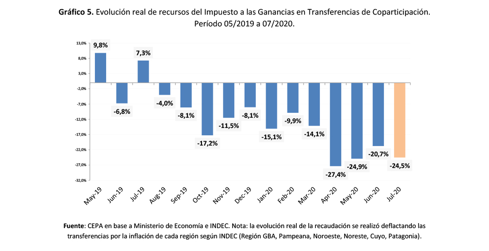 - En el caso del Impuesto a las Ganancias, la caída en julio alcanzaría 24,5%, cercano a los guarismos estimado en abril de 2020 (-27,4%) y mayo (24,9%).