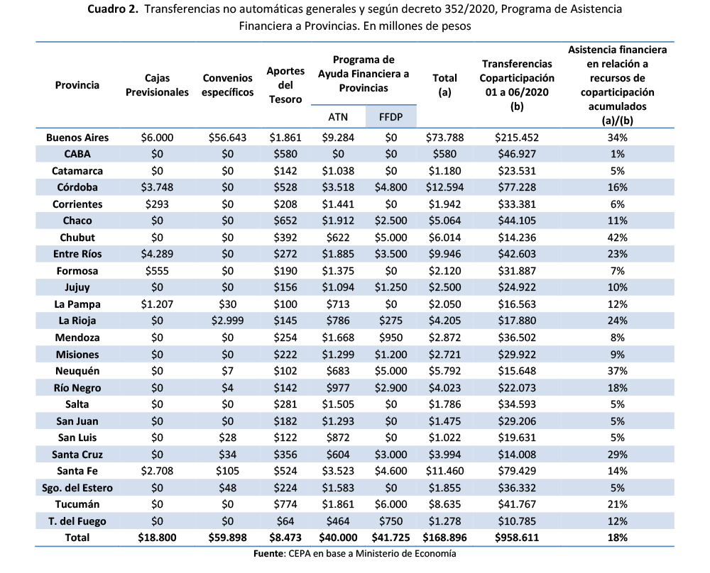 A través del decreto 352/20 se redestinaron recursos para mejorar los aportes del Tesoro a las jurisdicciones provinciales y para fortalecer el Fondo Fiduciario para el Desarrollo Provincial. El artículo 1 del decreto indica “Créase el PROGRAMA PARA LA EMERGENCIA FINANCIERA PROVINCIAL que tendrá por objeto asistir financieramente a las provincias, mediante la asignación de recursos provenientes del Fondo de Aportes del Tesoro Nacional y otros que se prevean para el otorgamiento de préstamos canalizados a través del FONDO FIDUCIARIO PARA EL DESARROLLO PROVINCIAL, por un monto total de PESOS CIENTO VEINTE MIL MILLONES ($ 120.000.000.000), con el objetivo de sostener el normal funcionamiento de las finanzas provinciales y cubrir las necesidades ocasionadas por la epidemia de Covid-19.” De este monto, $60.000 millones se orientaron al Fondo de Aportes del Tesoro Nacional para las Jurisdicciones Provinciales y la otra mitad, a fortalecer el Fondo Fiduciario para el Desarrollo Provincial.