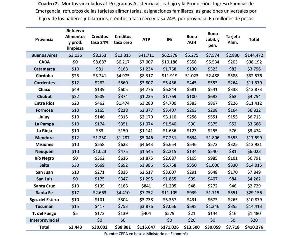 Pero además, las medidas para resguardar el empleo y el ingreso de sectores vulnerables han tenido un importante impacto en el sostenimiento de buena parte de la recaudación provincial. A continuación se detalla, provincia por provincia, los montos de los principales Programas: Asistencia al Trabajo y la Producción, el Ingreso Familiar de Emergencia, refuerzos de las tarjetas alimentarias, asignaciones familiares, asignaciones universales por hijo y de los haberes jubilatorios, además de los créditos a tasa cero y tasa del 24%.