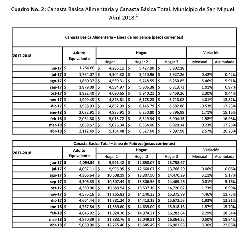 Por consiguiente, en San Miguel, una familia tipo (dos adultos y dos hijos) necesita un ingreso de $6.527,6 pesos para que sus miembros no sean indigentes y $15.545,49 para que sus miembros no sean pobres (ver cuadro No. 2).
